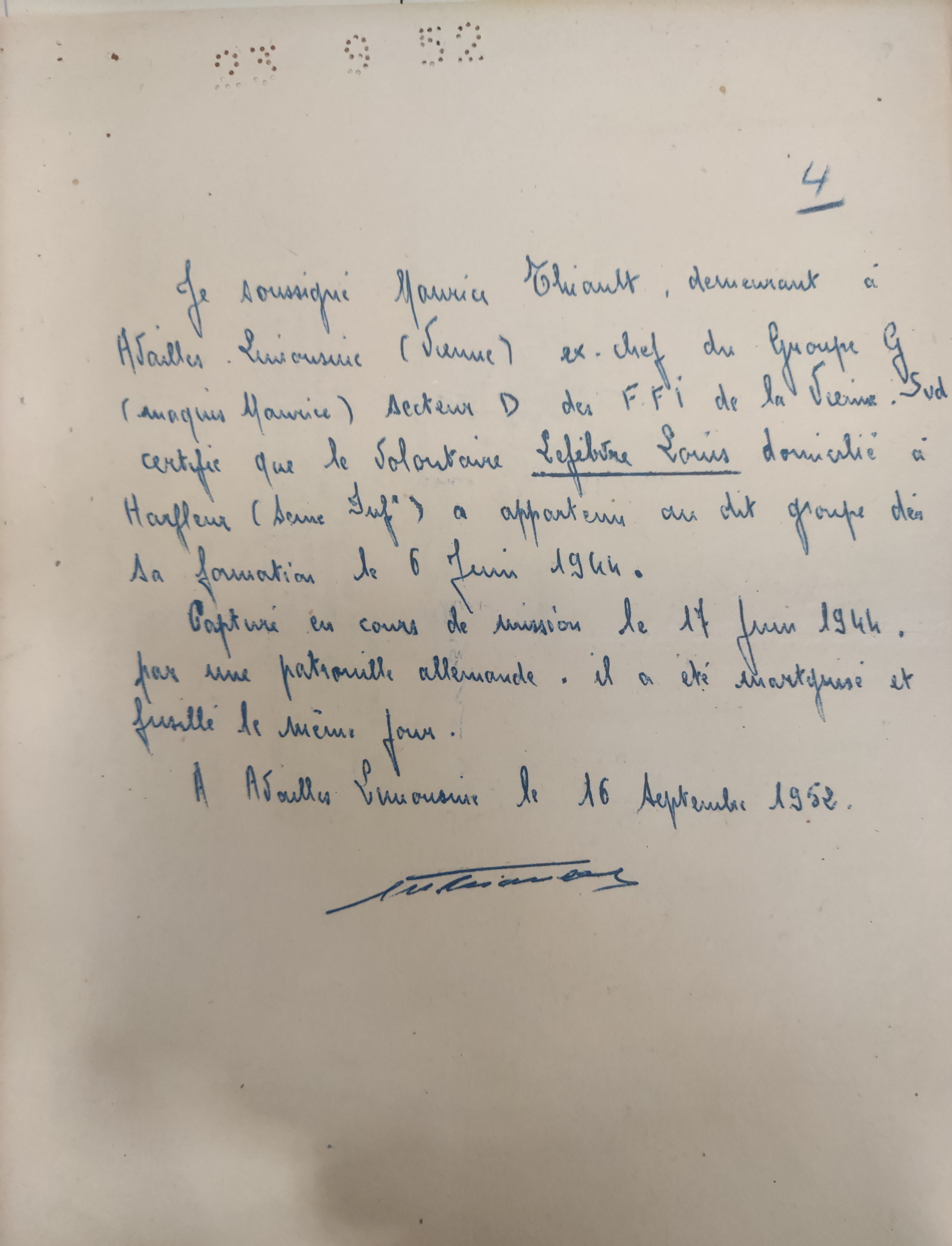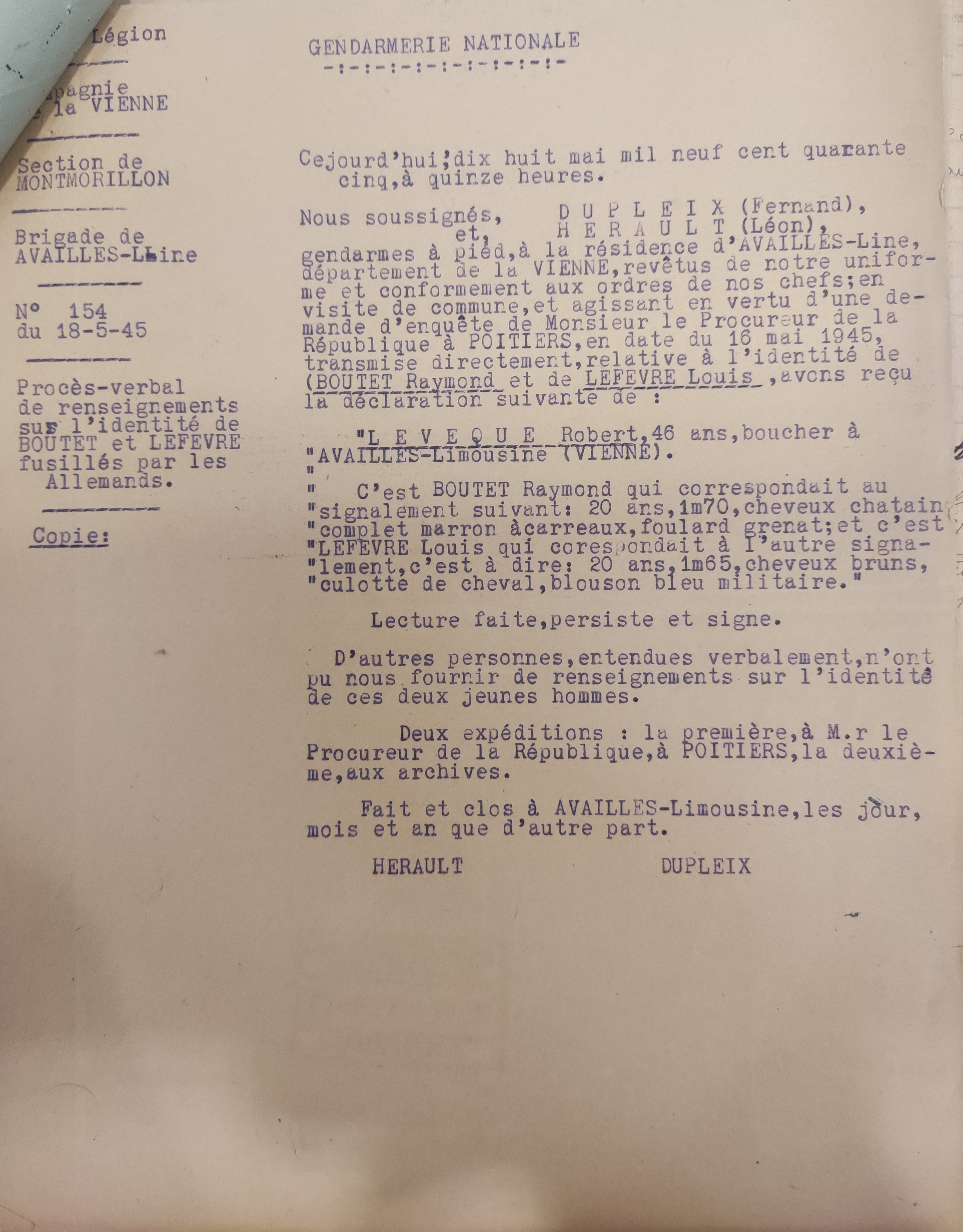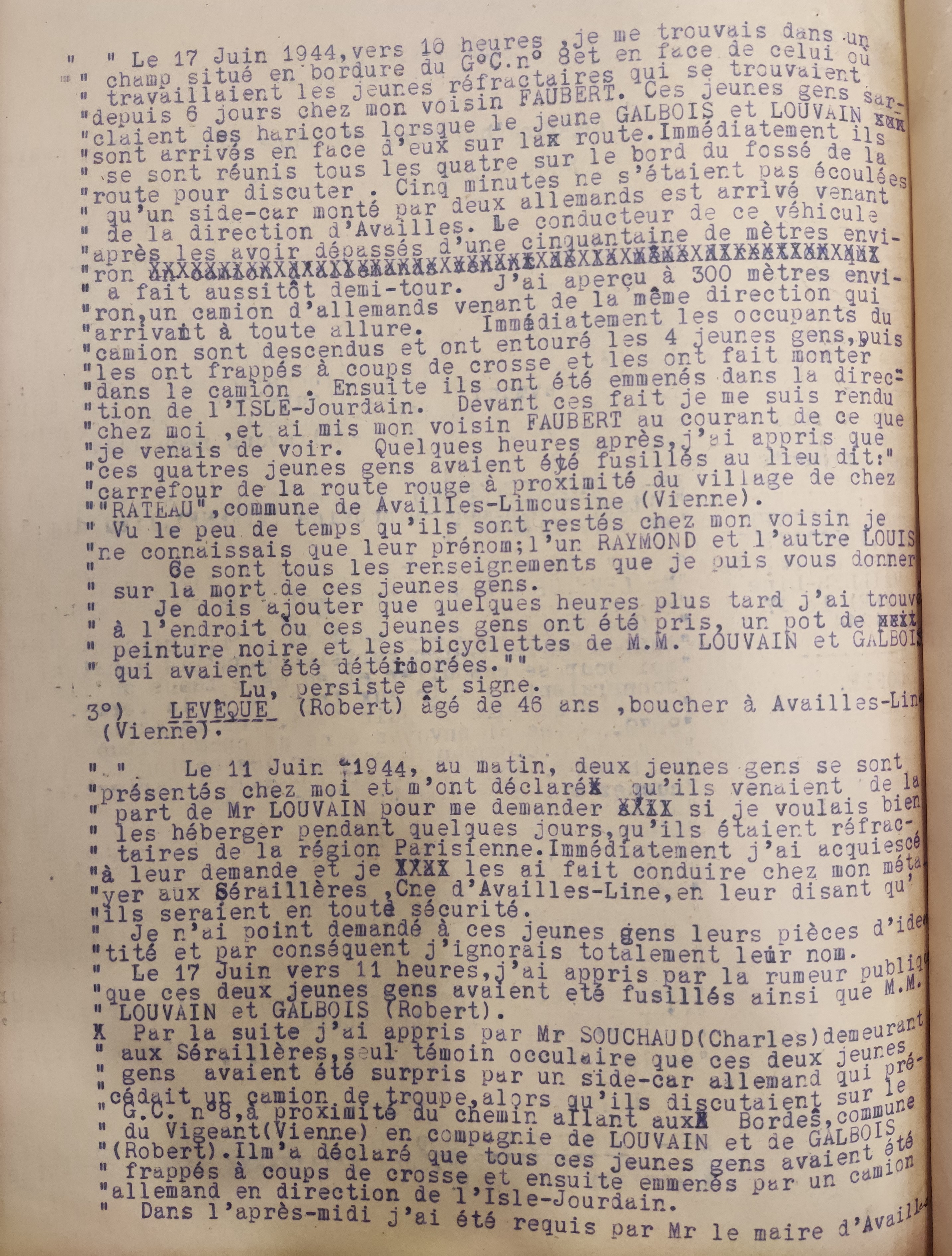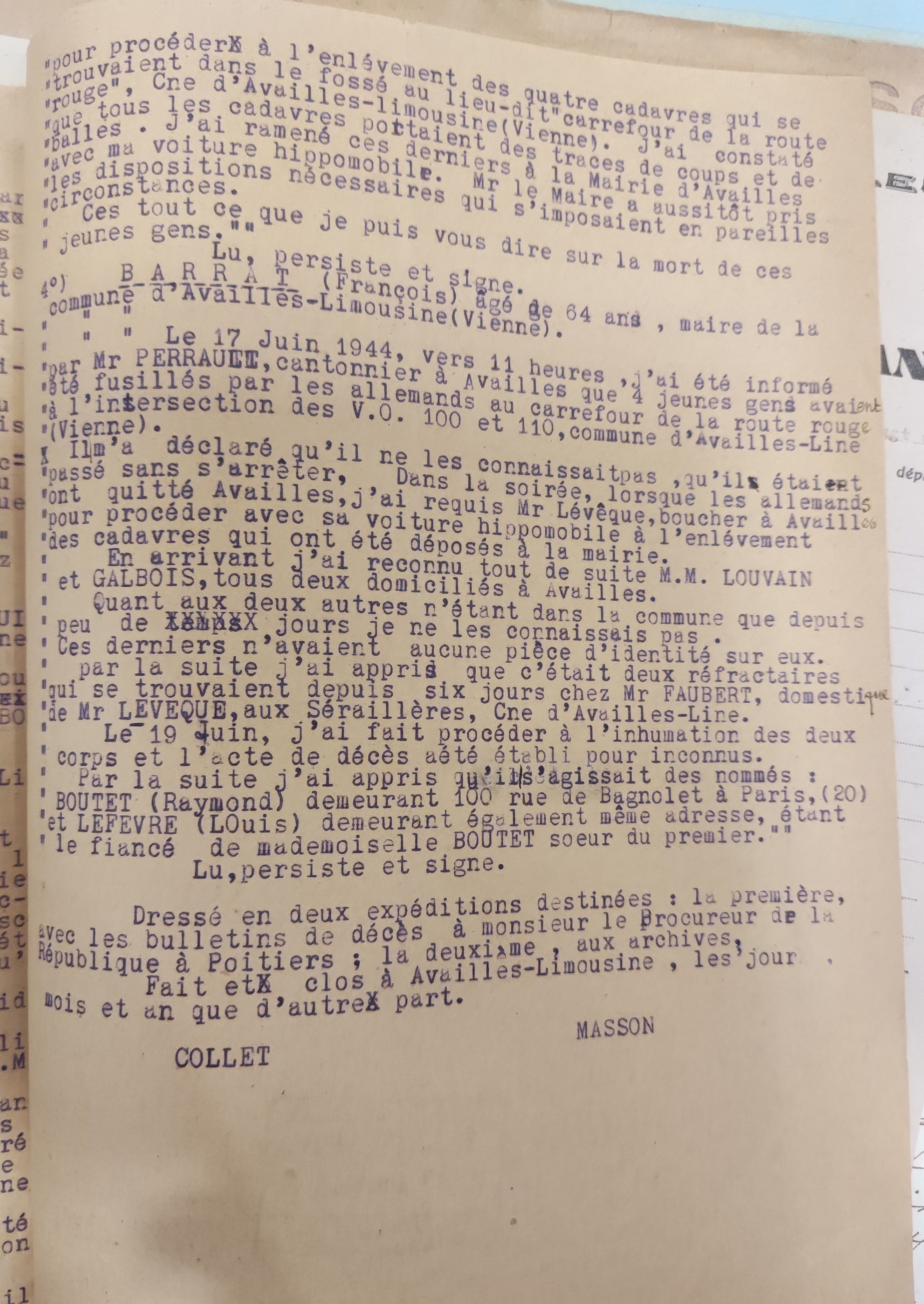 Accompagné d’un agent de liaison du maquis, il reçut l’aide de Louis LEFEBVRE et de Raymond Boutet. Ensemble, ils entreprirent de rendre illisibles les indications routières entre Availles-Limouzine et Le Vigeant.