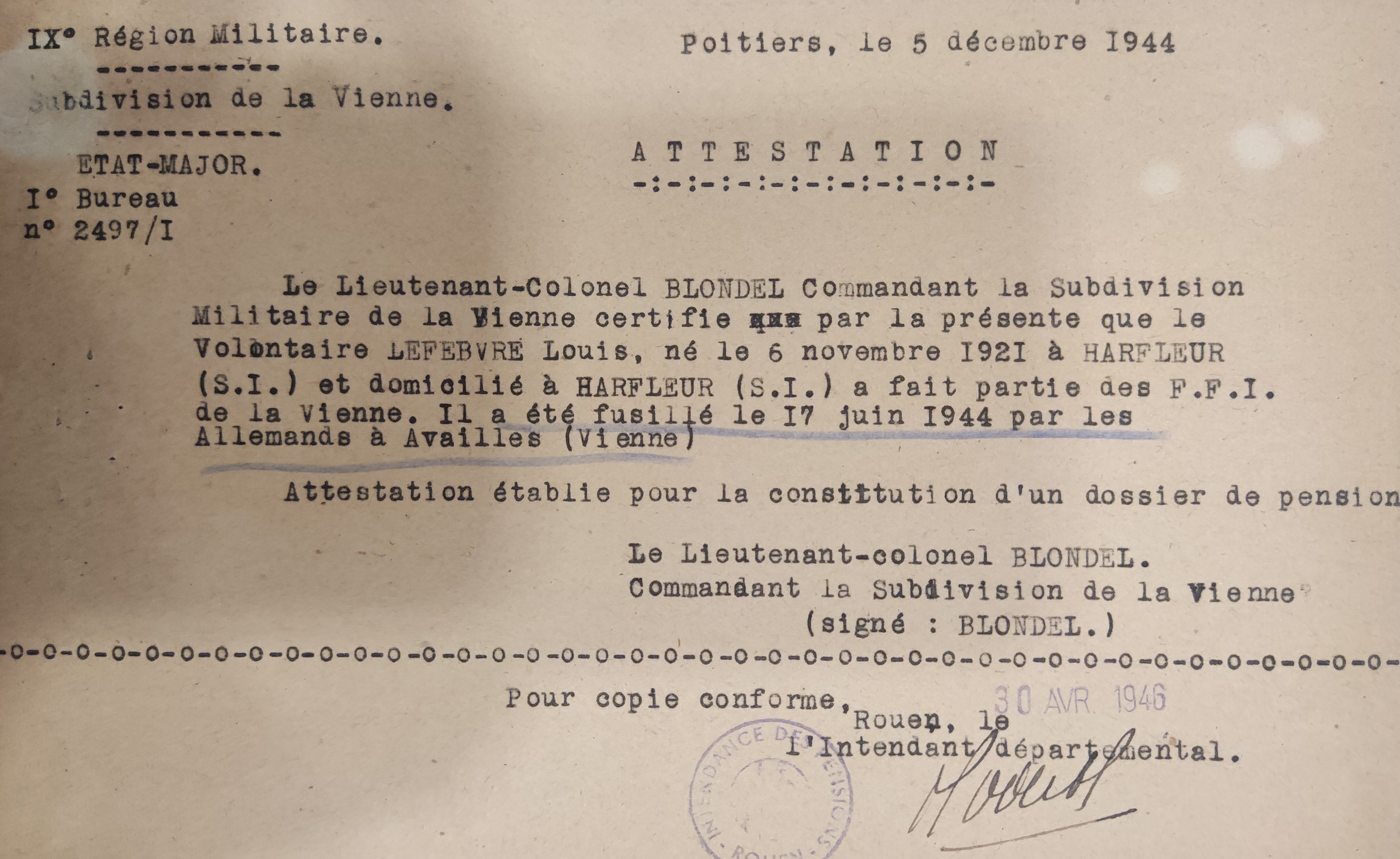Louis LEFEBVRE fut inhumé après la guerre au cimetière communal d’Harfleur.