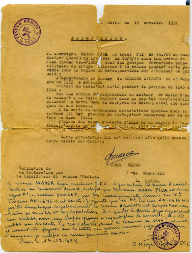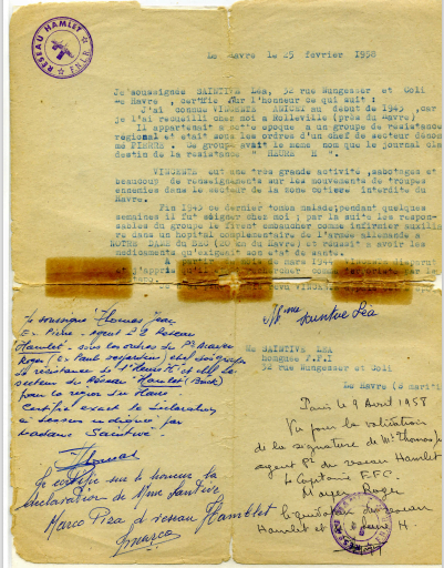 Compte tenu des circonstances de son départ du Havre, Roger Mayer indique dans son attestation qu'il a été "oublié" mais qu'il aurait dû figurer dans la liste des membres du réseau Hamlet Buckmaster.