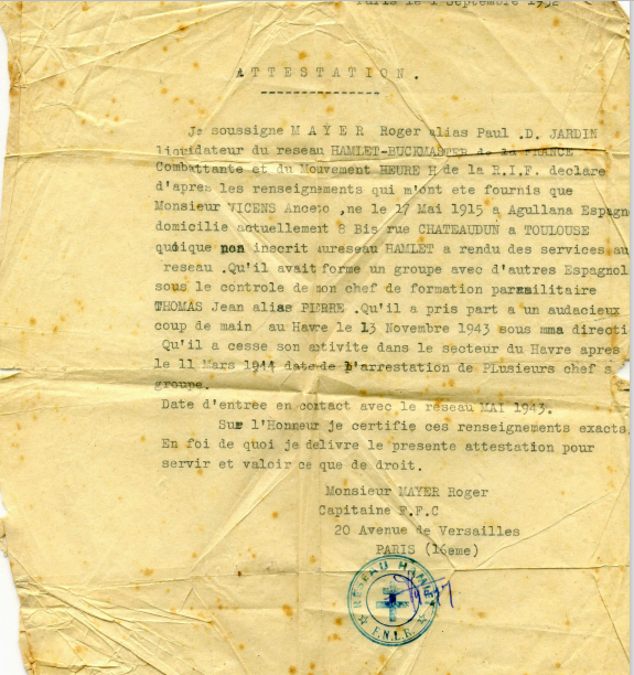 Il ajoute : "j'ai su par la suite que M Vicens vécut dans des conditions lamentables mais combien courageuses et nobles et qu'il réussit enfin, au prix de multiples difficultés, à rejoindre la France".